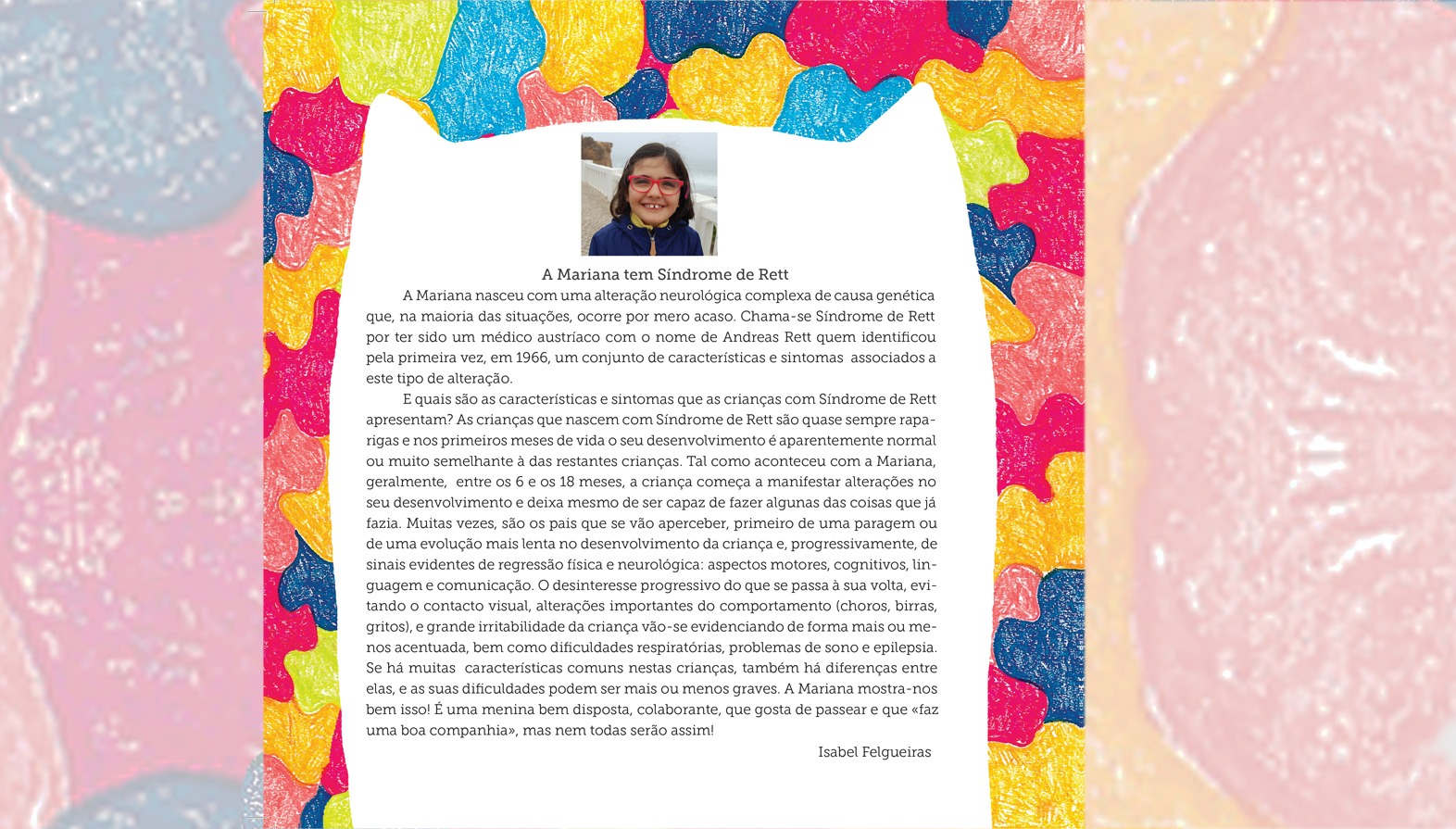 A Mariana tem Síndrome de Rett, uma alteração neurológica complexa de causa genética que, na maioria das situações, ocorre por mero acaso e que afeta, maioritariamente meninas. Nos primeiros meses de vida o seu desenvolvimento é aparentemente normal. Tal como aconteceu com a Mariana é, geralmente, entre os 6 e os 18 meses, que a criança começa a manifestar alterações no seu desenvolvimento e pode até perder algumas aquisições. Se querem ver a Mariana feliz, deixem-na ter a Gata Zu por perto enquanto vê a Heidi na televisão!